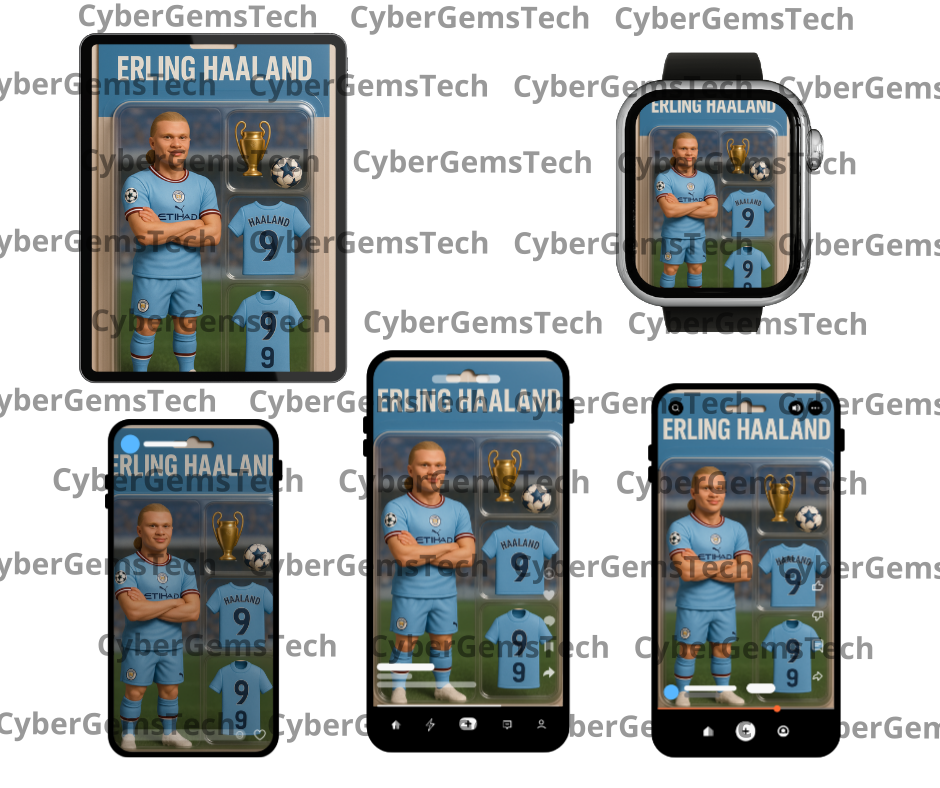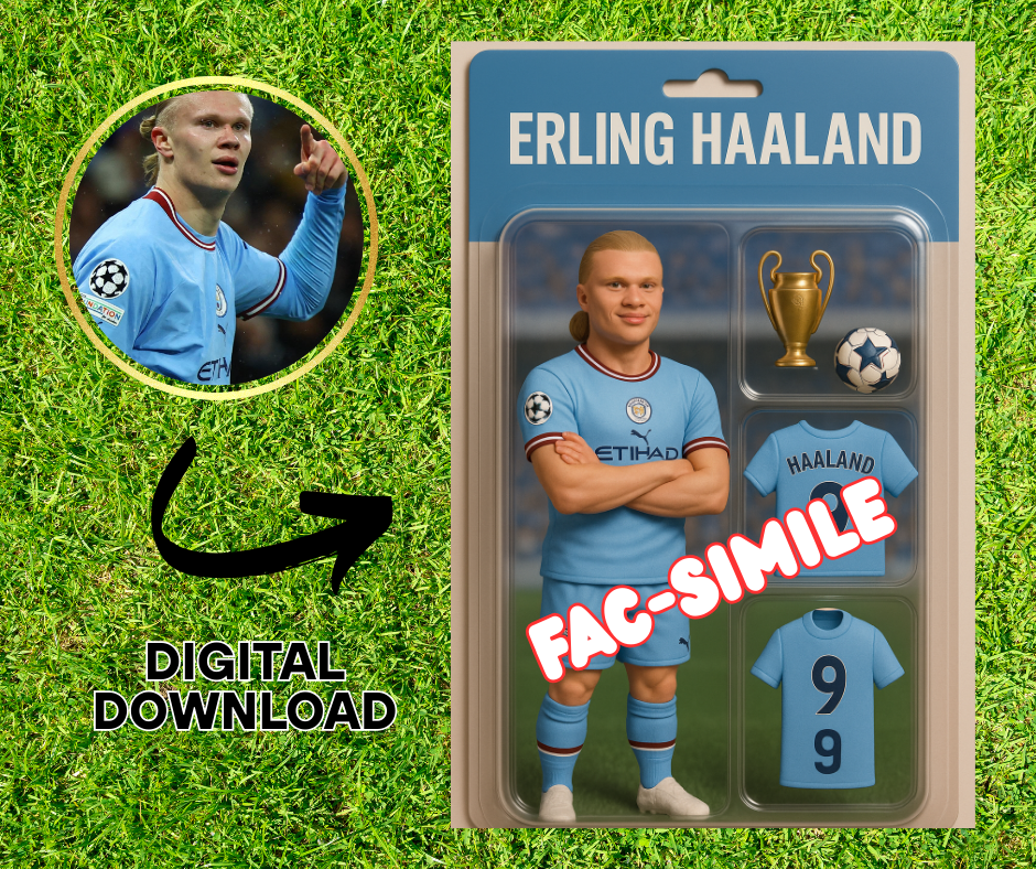 Erling Haaland Action Figure - File digitale pronto per la stampa per uso personale o per personalizzare lo sfondo del vostro telefono, PC o smartwatch. Questa opera d'arte stampabile è completamente personalizzabile e consente di aggiungere un tocco personale al look da collezione della vostra stella del calcio preferita.
